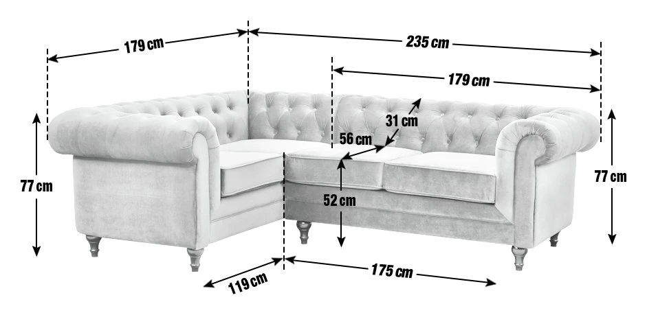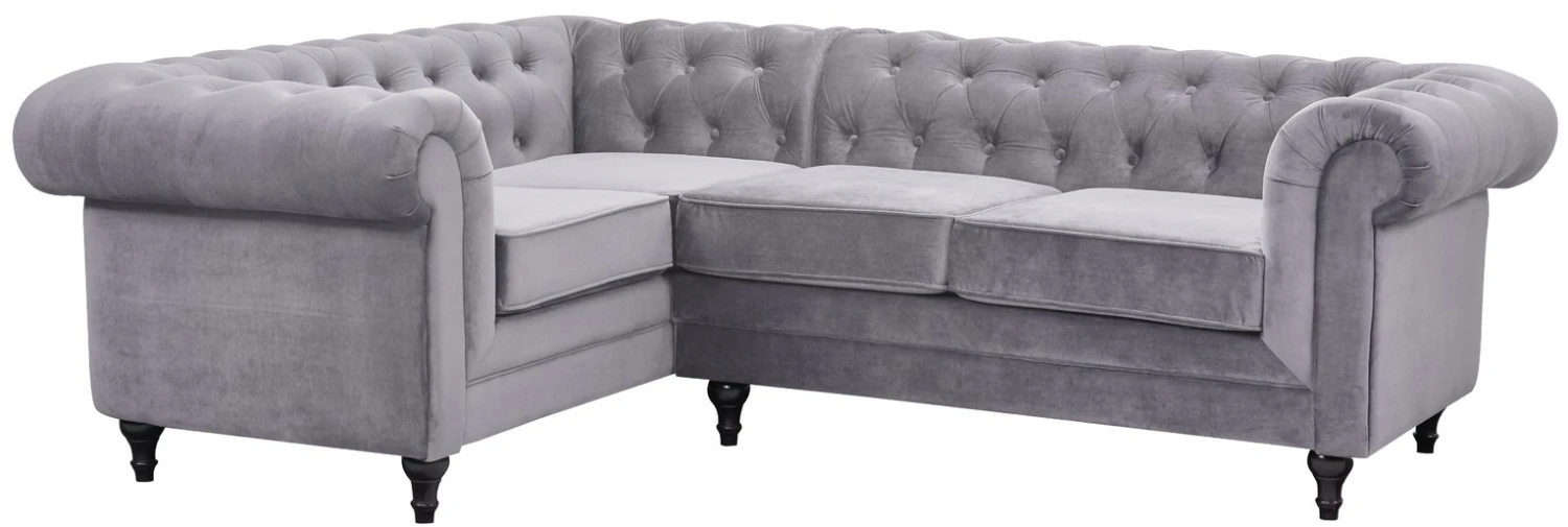 Timelessly tasteful. Beautifully upholstered in luxurious grey velvet, our Chesterfield right corner sofa is full of classic character. It has everything you’d expect from an iconic design. Sumptuous deep buttoning, scroll arms and turned wooden feet. Plump pocket-sprung cushions and piped edges add to its quality credentials. And it comes with modern corner hugging convenience. How good is that?