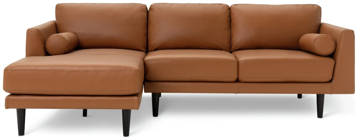 Join Jackson for some mid-century modern comfort. Upholstered in premium leather, this corner chaise sofa is invitingly indulgent. Wide and low it gives off those retro vibes. Lean on the arms and plump round bolsters, relax into the pocket sprung foam seats and fibre-filled back cushions. Now put your feet up and chill.