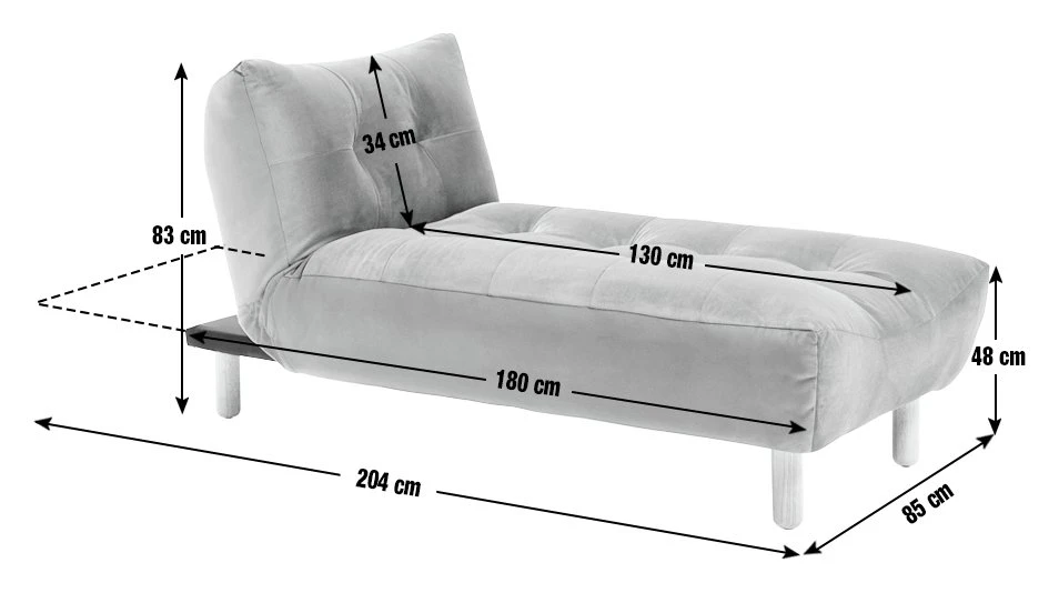 Laze in luxury. Our green chaise sofa is made for relaxing in the lounge or bedroom. Upholstered in 100% velvet, it’s decadently soft to touch. The dimpled curves, tufting detail and rounded wooden feet give it a real contemporary feel. And the foam filling is uber inviting. Raise the reclining end to chill in comfort or lower it and stretch out for a nap. Makes a handy bed for unexpected guests too. Get ready for a laid-back day kind of day.