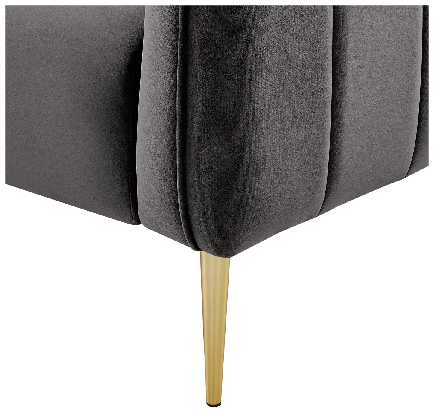 Our charcoal grey Lola chair is all about glamour. Upholstered in luxurious 100% velvet, the quilted design creates sumptuous seating. Plush and plump. Gold metal legs and piped trim enhance the elegance. Sit back and survey the room.