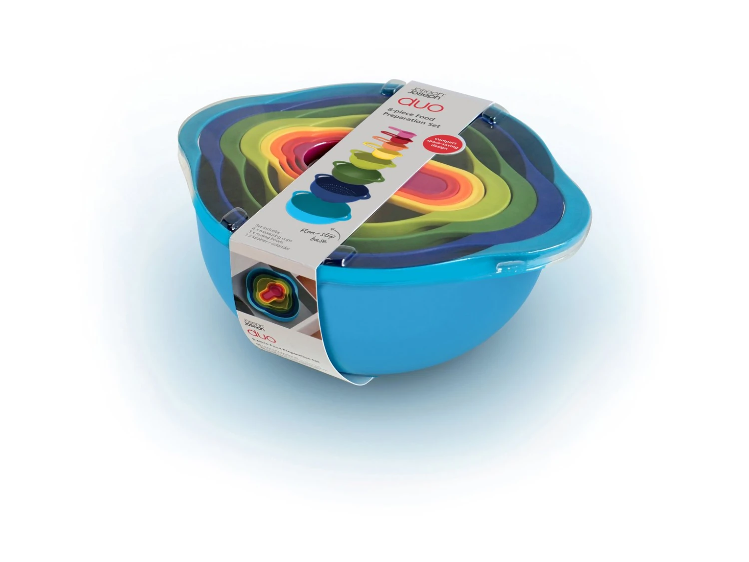 An 8 piece nesting bowl set from Joseph Joseph designed to meet all your food prep needs. The large mixing bowl has a non-slip base and wide carry handles. The small mixing bowl includes measurements inside for added convenience and a spout for accurate pouring. Measuring cups have been designed to ‘snap’ together securely and range in size from ¼ cup (60 ml) up to 1 cup (250 ml). The set also includes a large colander. The innovative design of this 8-piece set means everything stacks neatly together, saving space in your cupboards.