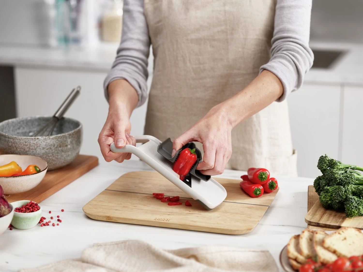 This handy gadget helps to create even slices of fruit or vegetables quickly and easily, whilst keeping your fingers safely away from its sharp stainless-steel blade. Unlike other mandolines, it has a precision food grip that allows you to slice a variety of items of differing shapes and sizes. It features a pinch grip for small items such as radishes or garlic cloves; a centre grip for slicing rounds from carrots or cucumber; and a flat grip for creating longer slices from foods such as onions or courgettes.