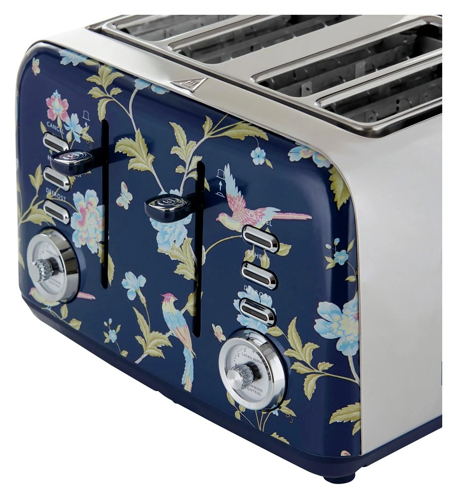 If you’re looking for a multi-functional toaster that not only makes the perfect toast but can cook tasty bagels, luscious crumpets, and wholesome thick-sliced bread then look no further! The Laura Ashley 4-Slice Toaster is the perfect match to make your breakfast and style your kitchen at the same time. The power output ranges from 1550-1850 watts.