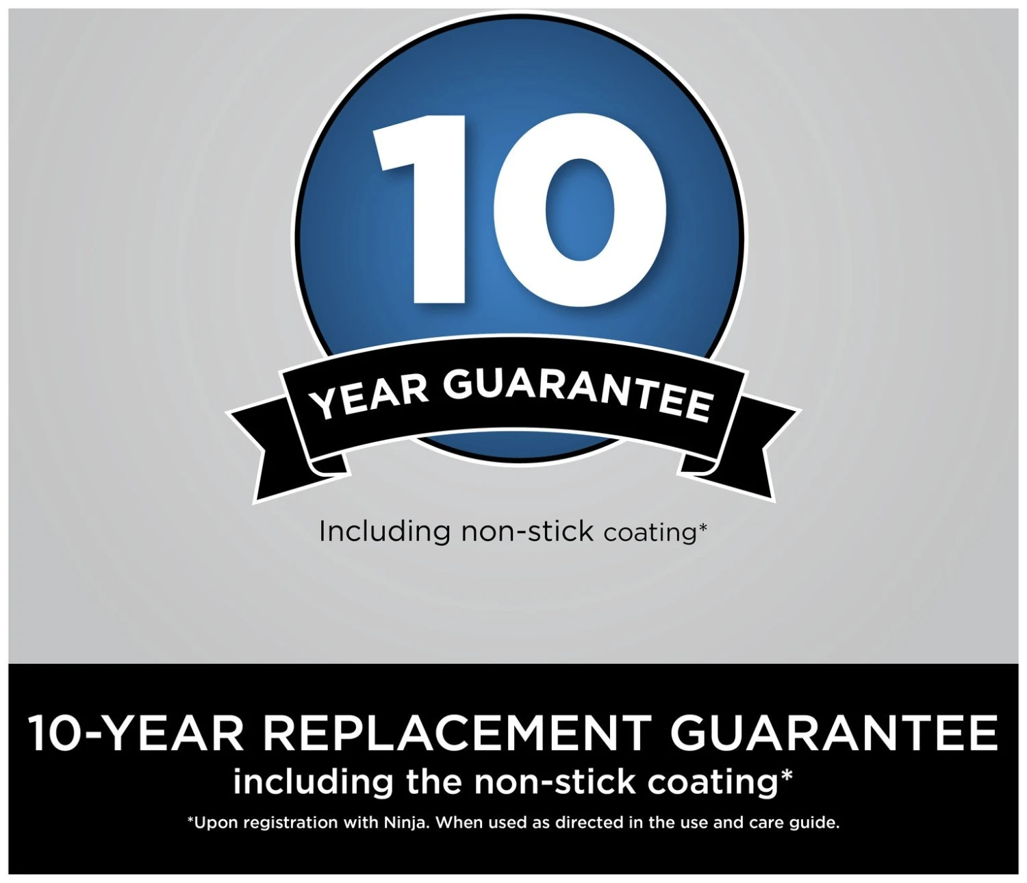 Even heating and no hot spots ensure perfectly cooked results. Cook using little to no oil. PFOA, lead and cadmium free. Ninja offers a 10 Year Replacement Guarantee, including the non-stick coating. Upon registration with Ninja. When used as directed in the use and care guide.