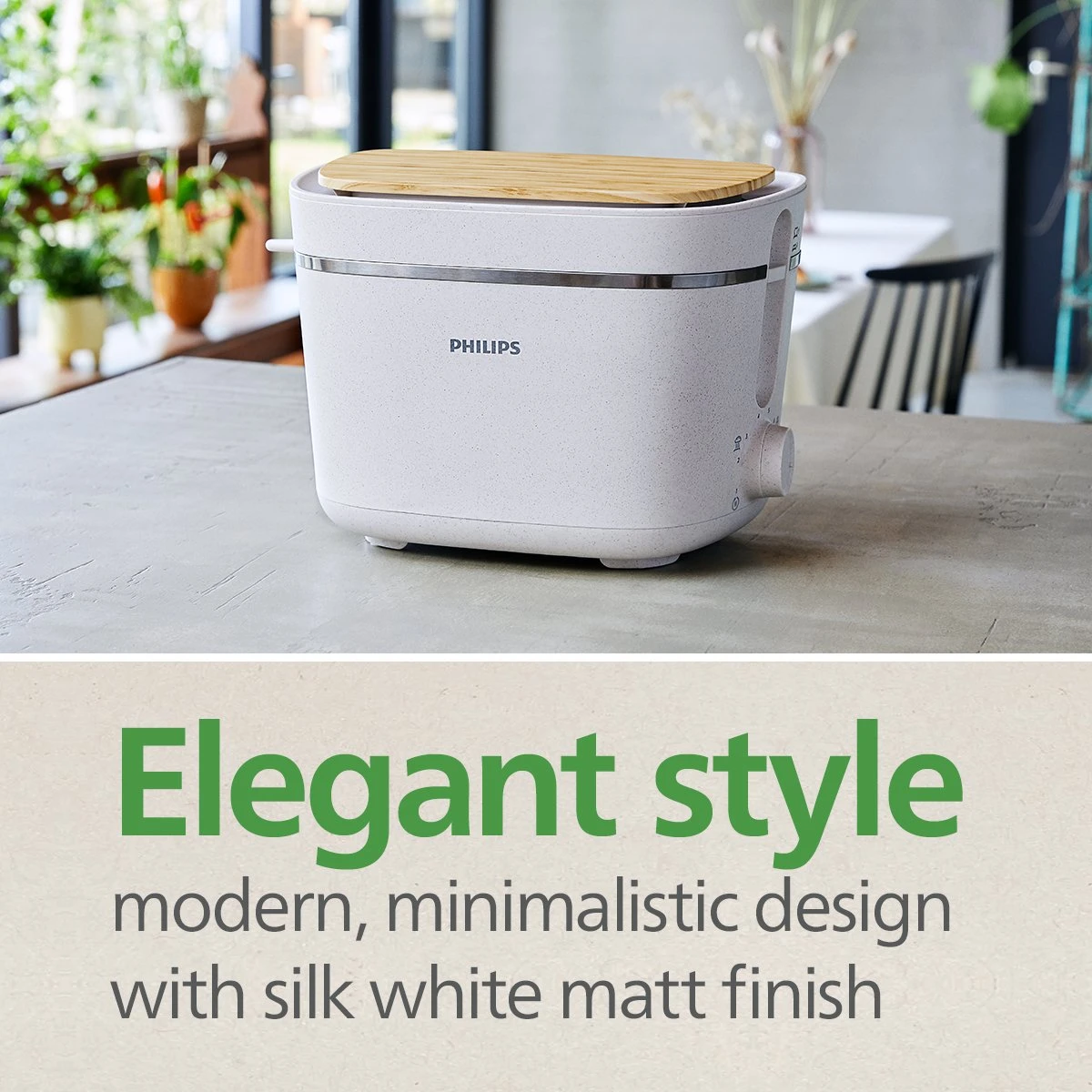 Make your toast exactly how you like it every morning, with elegant style and impeccable performance. Sustainably designed with plant-based plastics and energy-efficient features for a small step to a greener future.