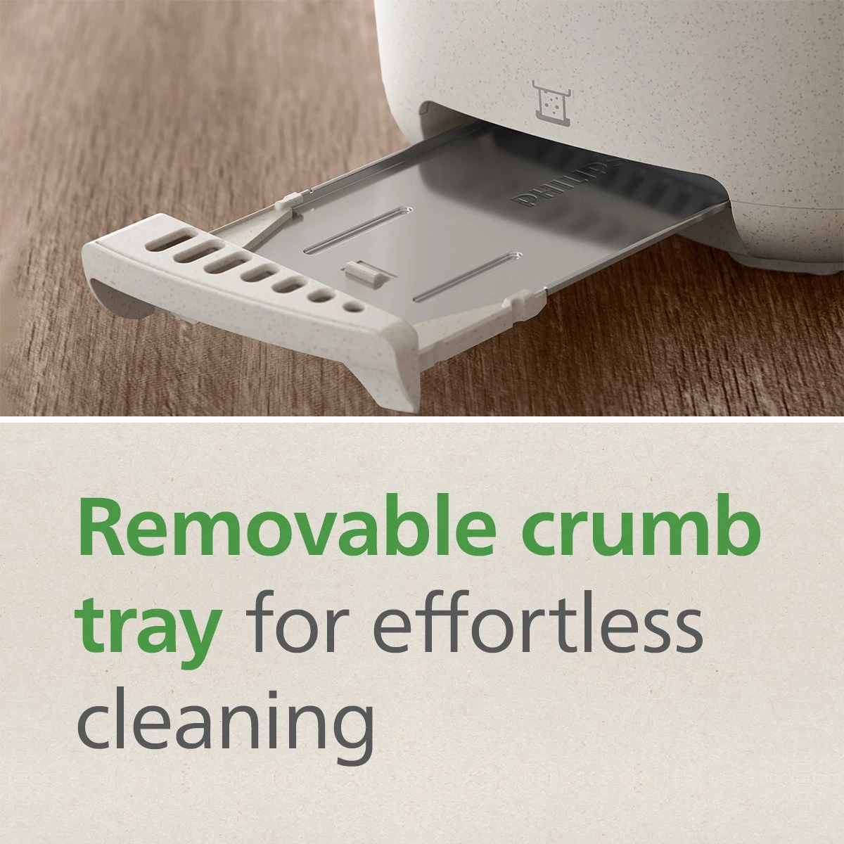 - Removable crumb tray.
