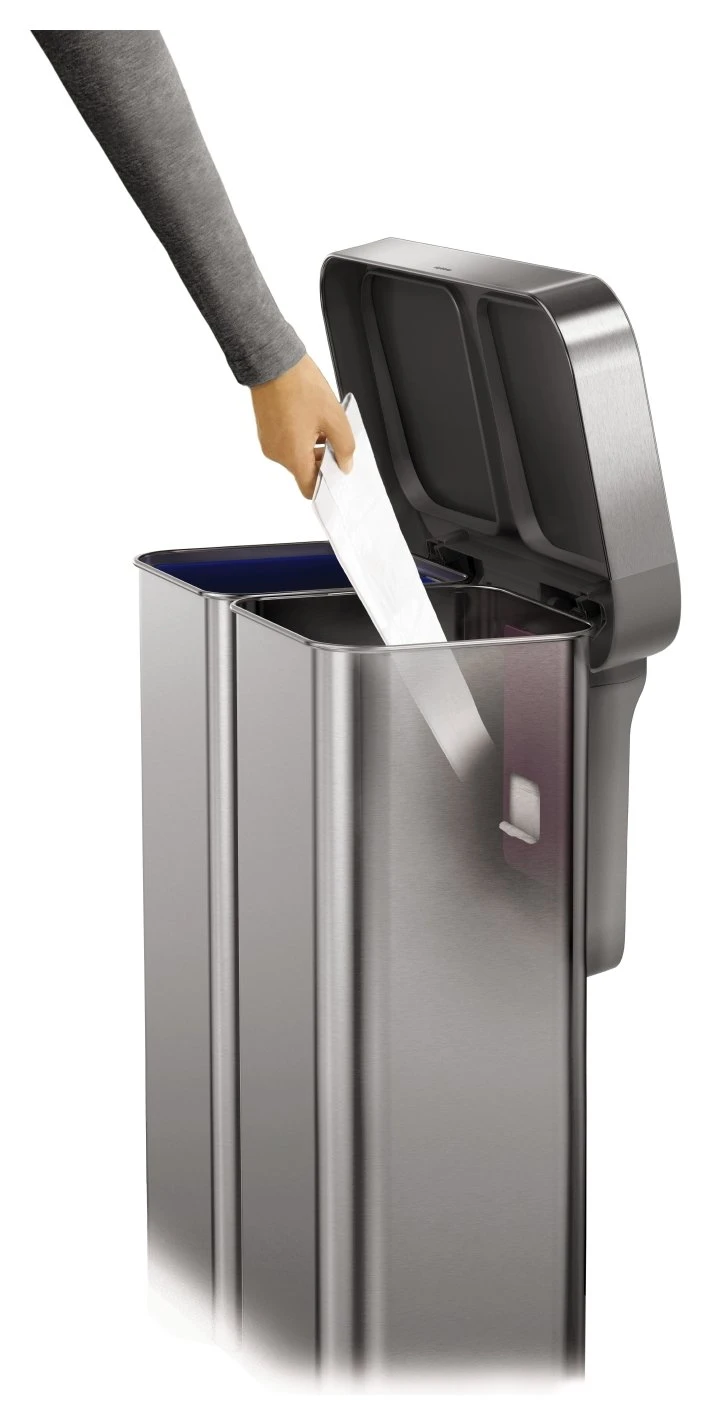 This simplehuman rectangular recycler has two compartments and a space-efficient shape that make it easy to separate rubbish and recyclables in one place. Finished in stainless steel, this stylish looking kitchen bin has a large 58 litre capacity, making it ideal for a busy family. There is also a bin liner pocket for Code H bin liners on the side for your convenience.