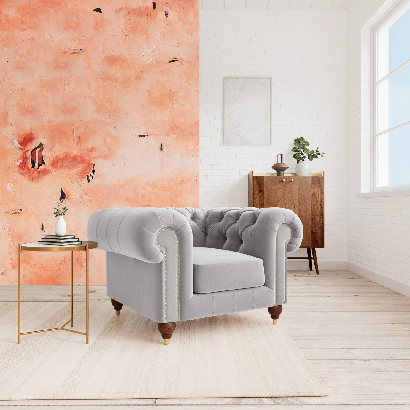 Classic Chesterfield design never goes out of style. It’s a total head-turner. The exaggerated scrolled arms, winking metal studs and a buttoned back combine to make for an armchair with a playful vibe.
