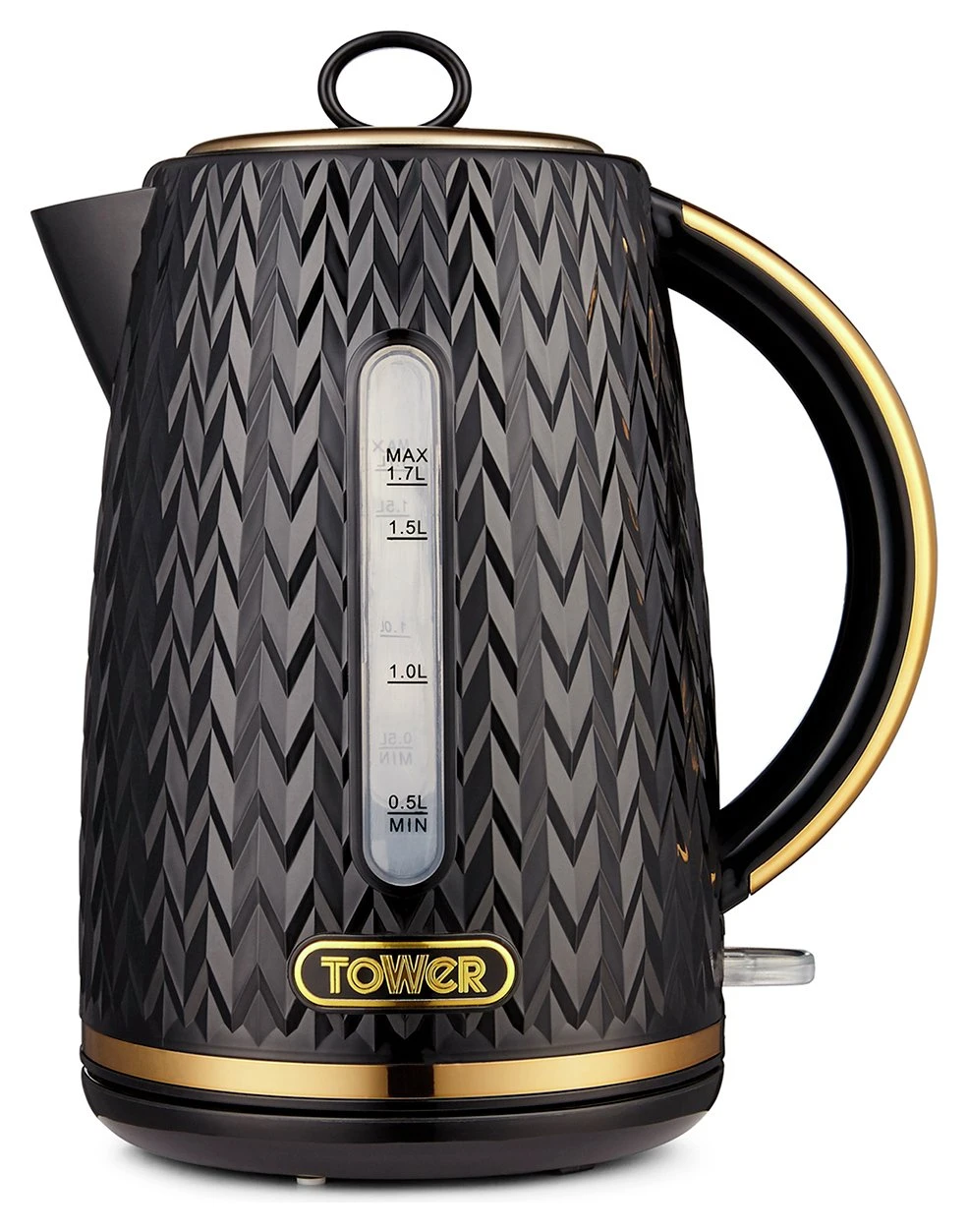 Housed within a striking textured black coating with bronze accents, this 3000 watt kettle brews hot beverages more efficiently, thanks to it’s rapid boiling system. The 1.7 litre capacity makes up to 7 cups from a single fill, and water level indicator window lets you view the content remaining inside. Set on a 360 degree base, with pull up lid for easy refilling and a removable filter. Automatic shut-off and boil dry protection ensure safety and peace of mind.