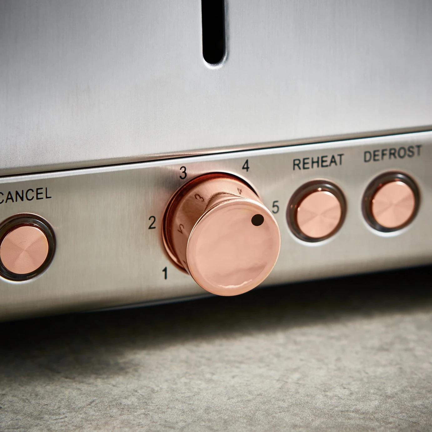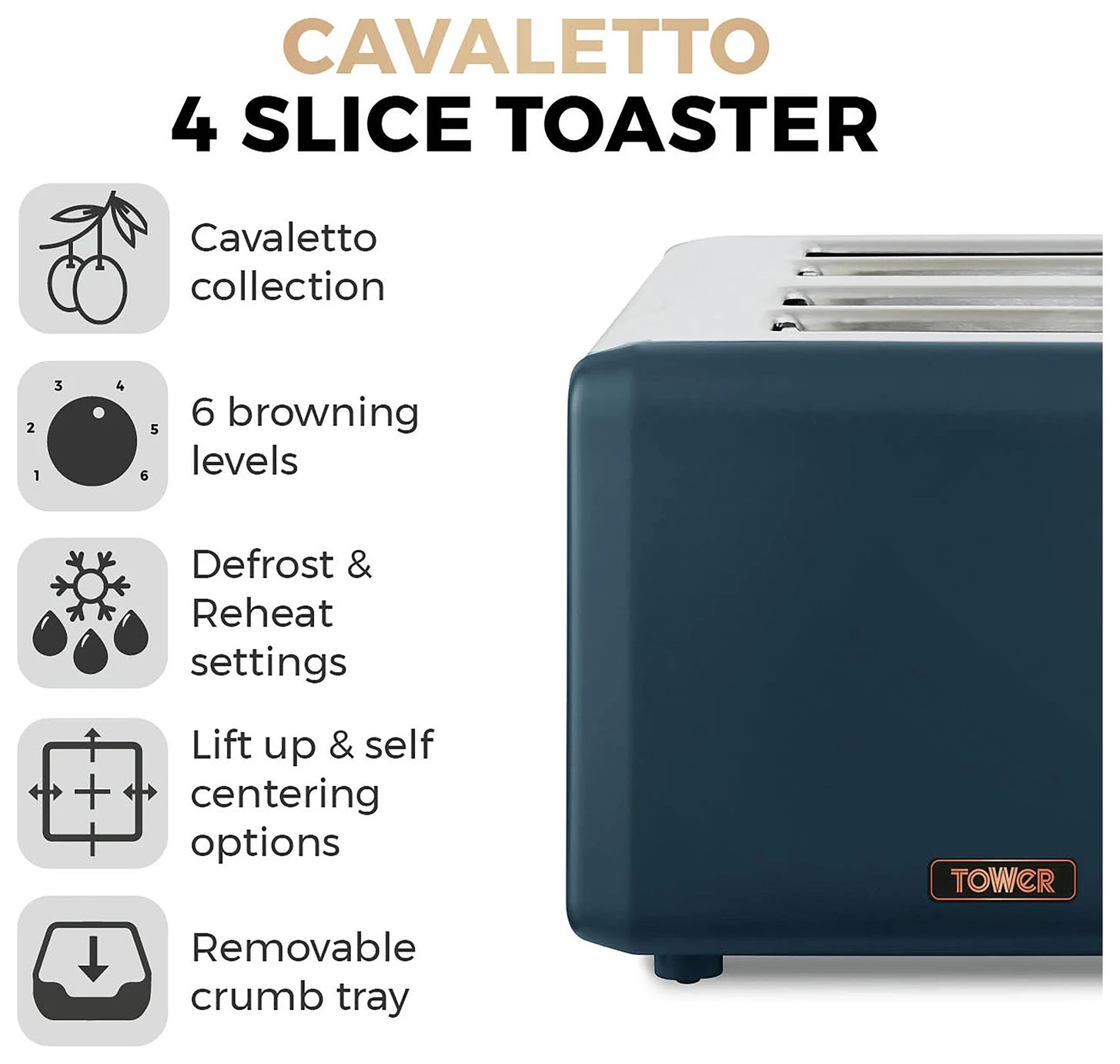 Collaborating midnight blue with rose gold tones, this Cavaletto 4 slice toaster injects a splash of colour into your breakfast routine. The defrost, reheat and cancel options put you in control of the toasting cycle, so you can warm up your snacks or toast straight from frozen. And with a variable browning control, you can select your preferring toasting texture to suit your taste.
