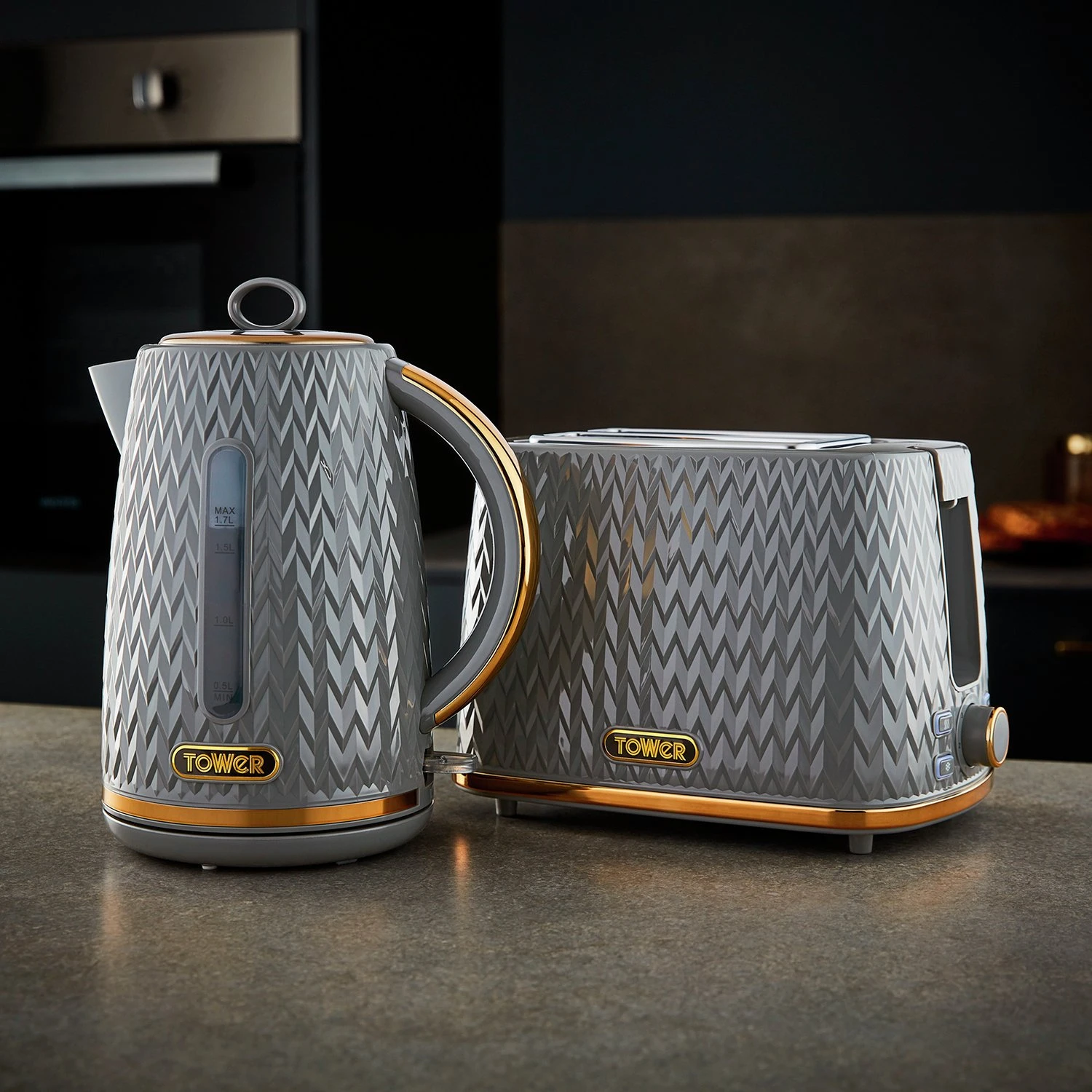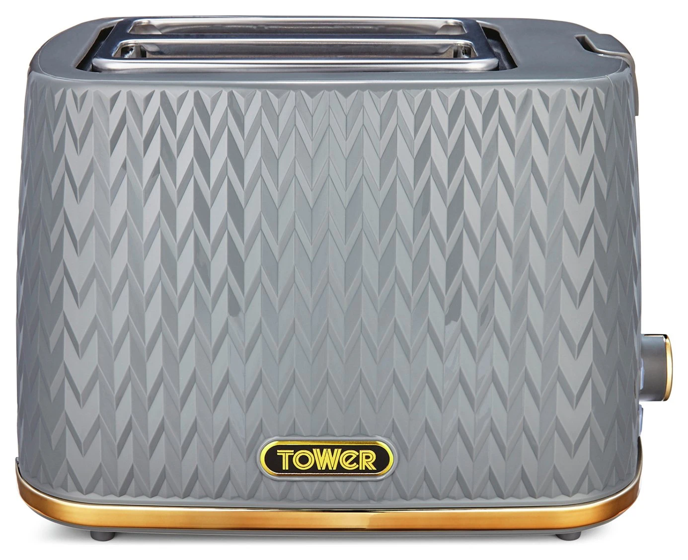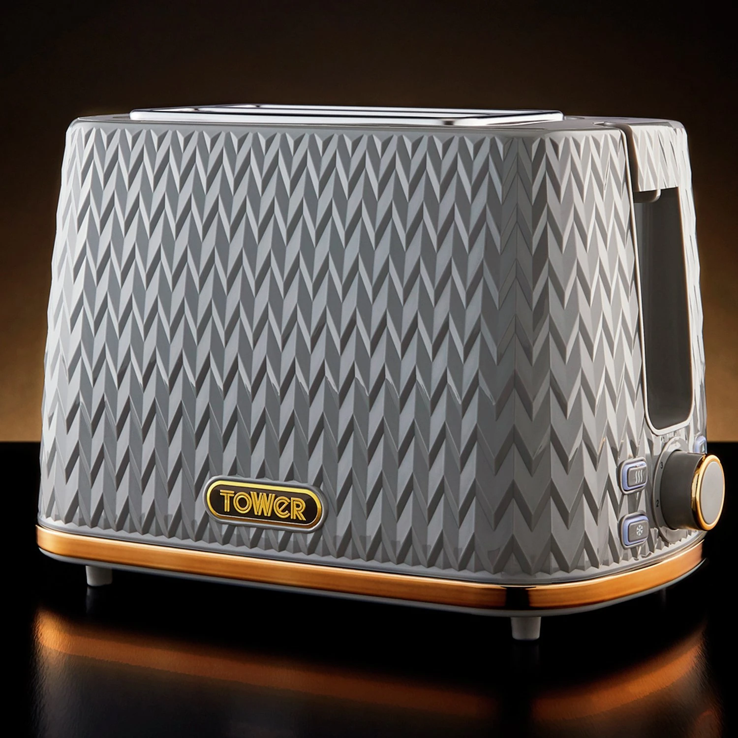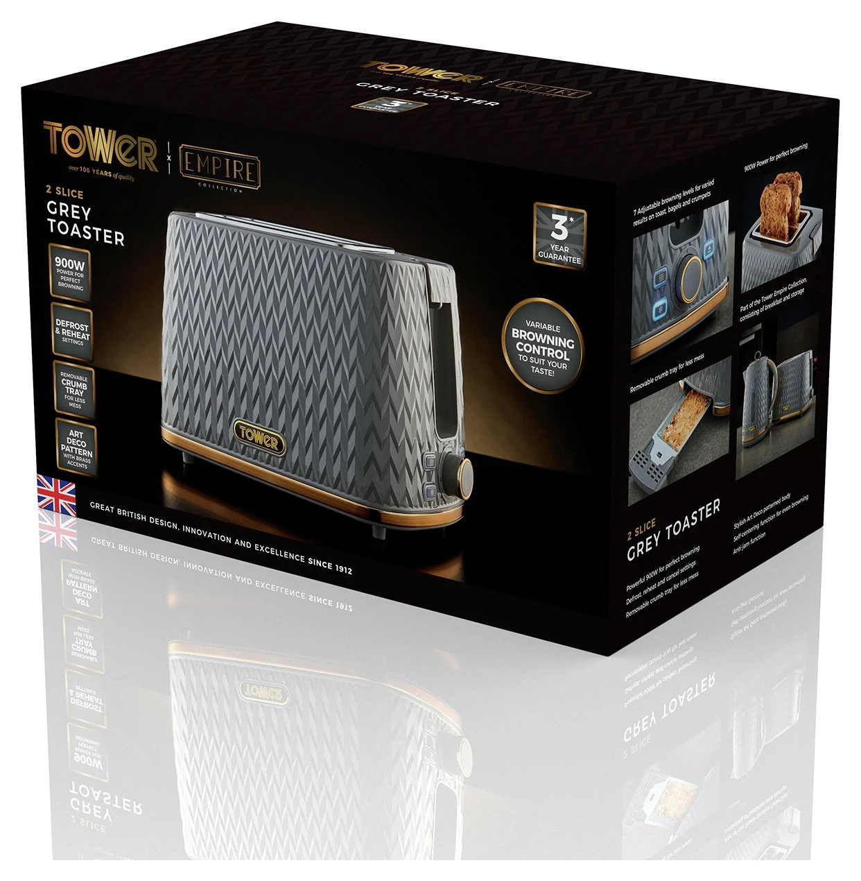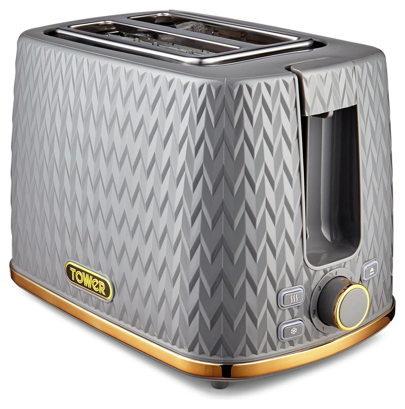 Empire patterned grey coated 2-slice toaster with bronze accents. 2 toasting slots provide enough space for various sized loaves; while the adjustable browning control’s 7 different settings lets you select your ideal browning consistency. The self-centring function provides even coverage during toasting. The defrost and reheat options provide complete control, with an anti-jam function and an automatic turn off function for safe operation. The removable crumb tray and integrated cord storage provide easy cleaning and neat storage after use.